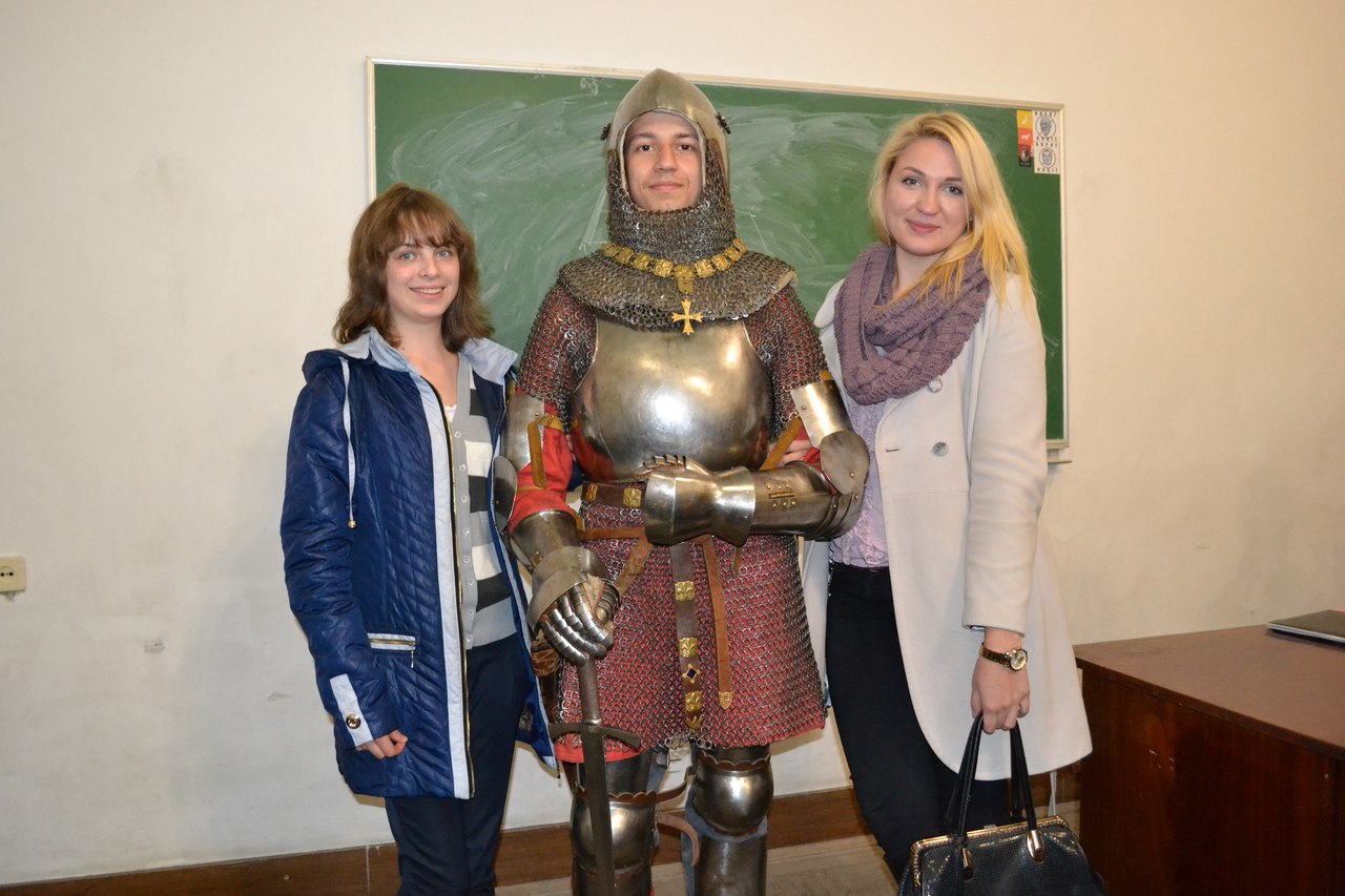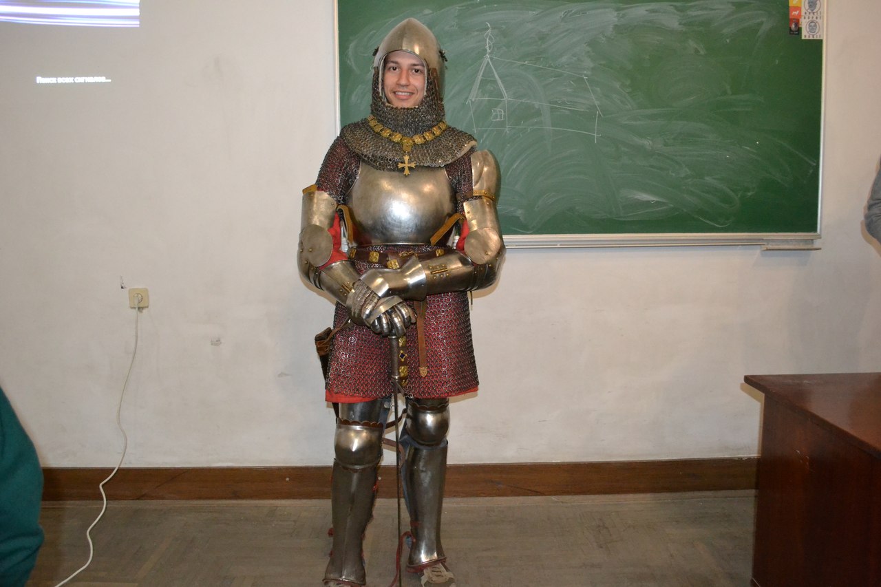 Найголовніше – окрім гарної лекції, лектор (Віталій) та його помічник (Андрій Леськів) принесли середньовічні обладунки та озброєння!!!