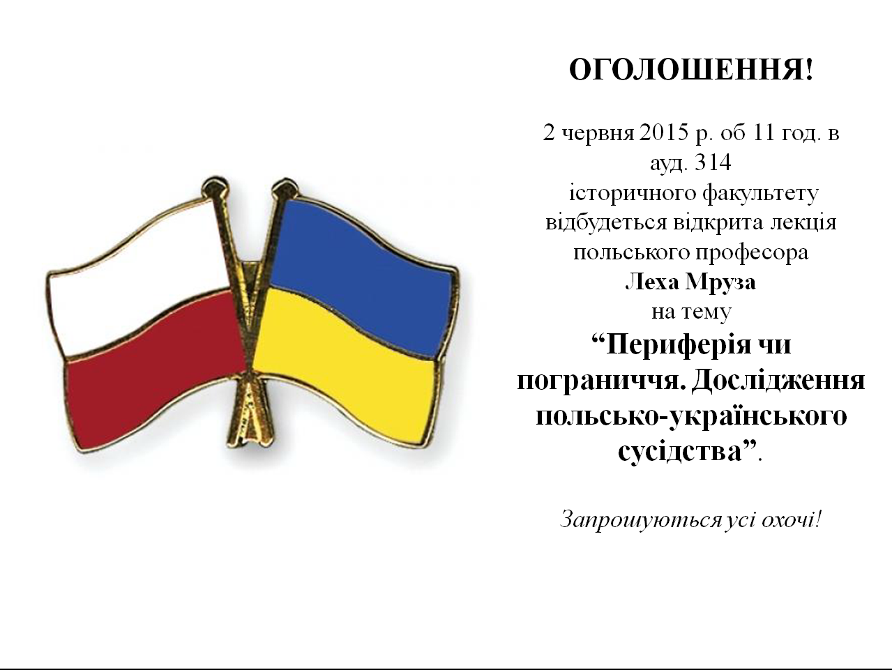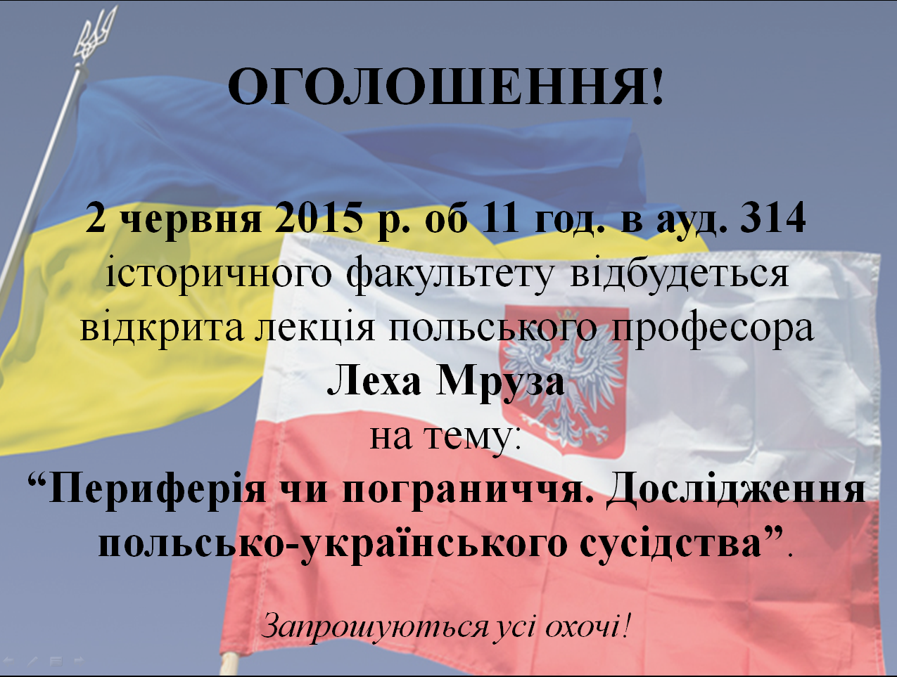 2 червня 2015 р. об 11 год. в ауд. 314 історичного факультету відбудеться відкрита лекція професора Леха Мруза