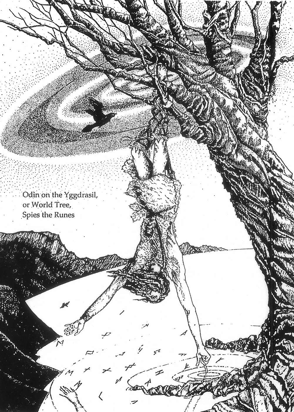 Інший міф пов’язує Одіна з створенням рун – першої сакральної скандинавської писемності. Заради цього він повісився на Іггдрасілі і провисів там дев’ять днів і дев’ять ночей. Після чого отримав право випити священного меду з рук свого діда, грімтурсена Бельтрона і отримав священні руни.