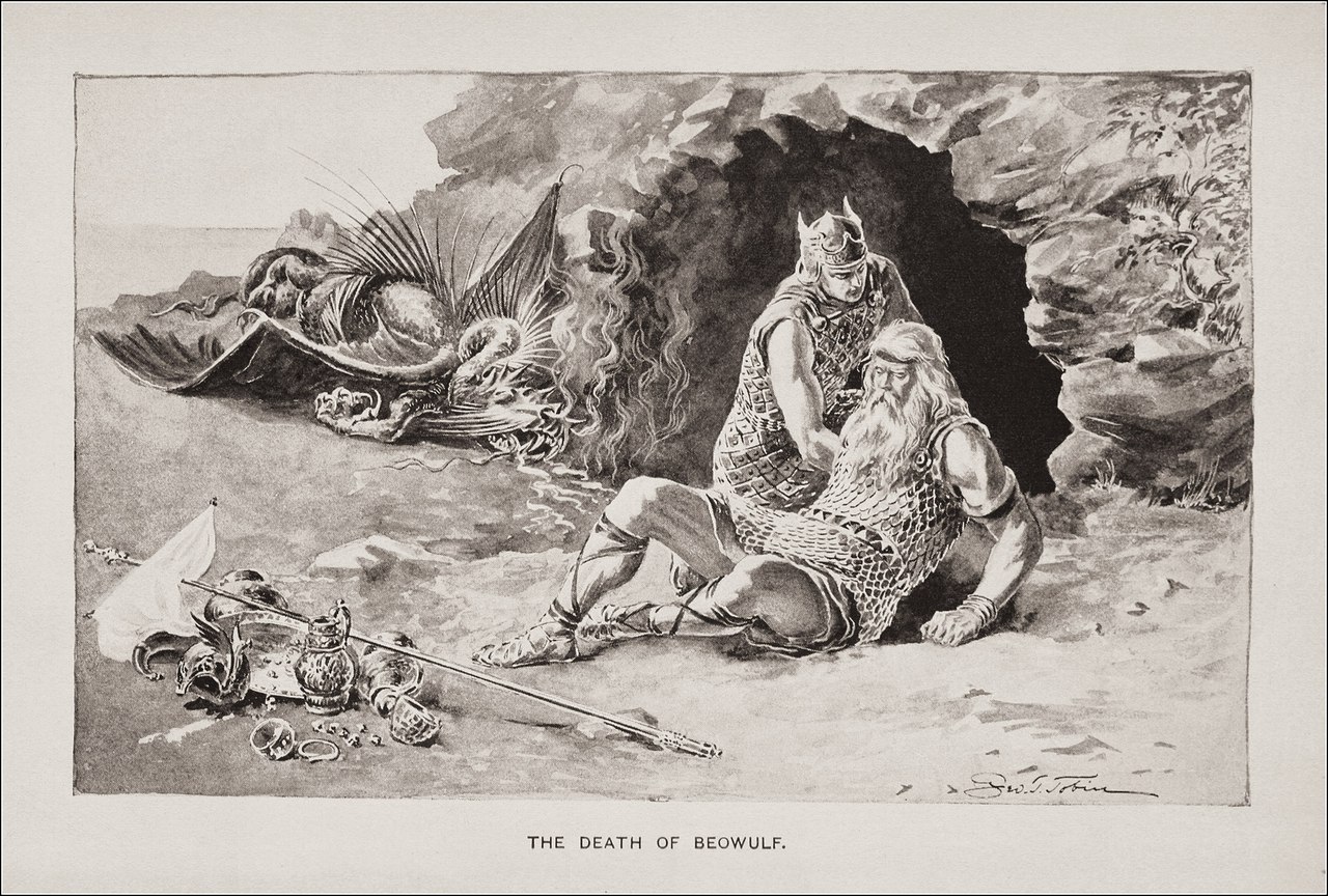 Найважливішою пам’яткою англосаксонського епосу є героїчна поема «Беовульф», яка була записана в Х-ХІ ст.. Імена історичних постатей зображених тут відносяться до V-VI ст.. Мова запису давньоанглійська, проте описані події відбуваються на території сучасної Данії, тому до сьогодні англійці й дани сперечаються про належність цього епосу до їх літературних здобутків. Тут розповідається про пригоди племінника ґаутського конунга Беовульфа (ім’я перекладається як «бджолиний вовк» – кенінг ведмедя). Він зі своєю дружиною у пошуках слави дістається Данії, де на той час правив Гротґар – славний конунг, який у досить поважному віці не міг захистити країну від нападів злих тролів (Гренделя та його матері). Головний герой перемагає обох чудовиськ, здобуває пошану від данського конунга і вертається додому, де згодом сам стає конунгом ґаутів. Проходить 50 років славного правління Беовульфа, які обриваються, коли один із його підданих з печери скарбів, яку стеріг дракон, краде золотий кубок. На цьому кубку (як і на всіх драконових скарбах) лежить смертельне прокляття, тож охоронець печери рушає вбити крадія, руйнуючи заодно половину ґаутських міст. На битву з чудовиськом виходить Беовульф зі своєю дружиною.