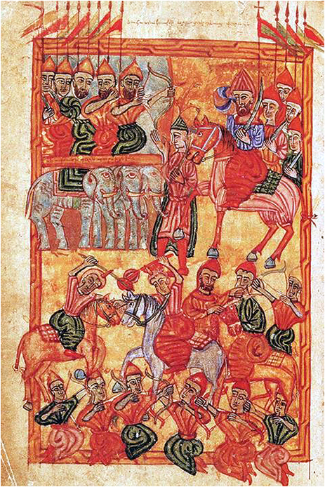 Найкраще доповнюють наші відомості зображувальні джерела, які подають загальне уявлення про вигляд тодішнього воїна. Найбільш інформативним у цьому плані є барельєф на фасаді церкви святого Хреста на острові Ахтамар (озеро Ван, Туреччина), де вирізьблено зображення біблійного Голіафа (Х ст.) у повному бойовому обладунку [37, p. 20]. Окрему цінність становлять книжкові мініатюри, де показано різноманітні види зброї та броні, що навіть дозволяє ознайомитись із принципом їхньої дії. Більшість із необхідних мініатюр знаходимо в додатках до дисертації доктора філософії Д. Ніколя, де автор змальовував їх з оригінальних манускриптів збережених у архівах Венеції, Матенадарана, Ечміадзіна (Вірменія) і т.д. [38, illustr. № 239–251].