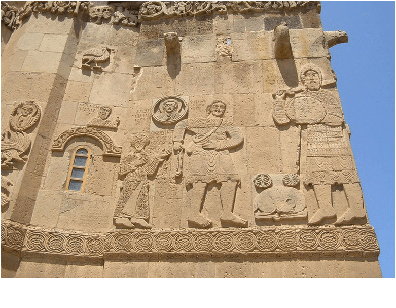 Найкращим джерелом, в плані вивчення захисного озброєння, є барельєф на фасаді церкви святого Хреста на острові Ахтамар, де вирізьблено зображення біблійного Голіафа (Х ст.), одягненого в ламеллярний обладунок (типу «пончо») з лускатим нагрудником (міг бути й кольчужний) та наручами [37, p. 20]. Такого роду комбінації обладунків мали хороший захист та були поширеними не тільки на Закавказзі, але й на Русі та Візантії [15, c. 76–77].