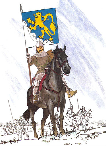 Важкоозброєний воїн Подільської хоругви: корпус рицаря захищає панцир типу бригантини, а поверх нього бачимо котту із гербом Подільської землі; на голові – шолом-бацинет типу «гундсгугель», до якого приєднана кольчужна бармиця, метою якої був захист шиї і плечей; озброєння складається із меча і маклера – невеликого круглого щита для пішого рукопашного бою, а також кинджала-ронделя. У воїна немає рицарського пояса, тож він не посвячений у рицарі; дворянин – гермек (реконструкція автора статті)