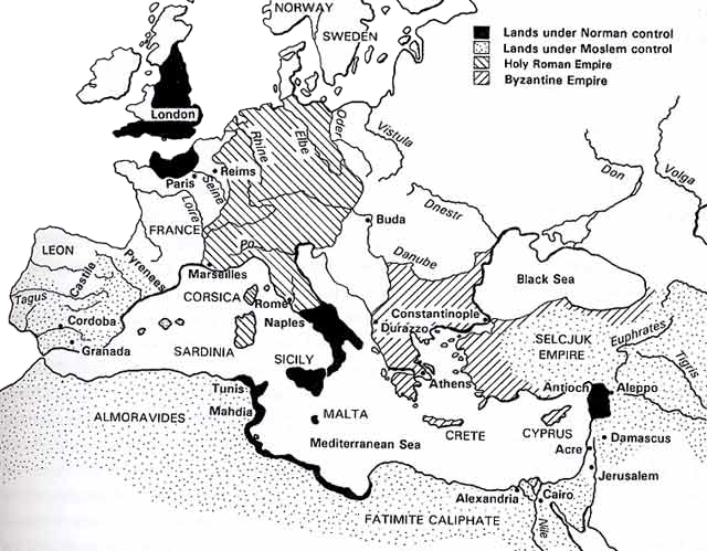 В 1091 р. під проводом Роже де Отвіля, сина Танкреда де Отвіля, нормандського барона, нормани повністю захоплюють Сицилію, вибиваючи звідти арабів. Так його племінник БоемундТарентський брав участь в І Хрестовому поході, а вже його син Рожер ІІ, об’єднав Сицилію та Південну Італію в одну державу й в 1130 р. коронувався з рук папи Григорія ІХ.