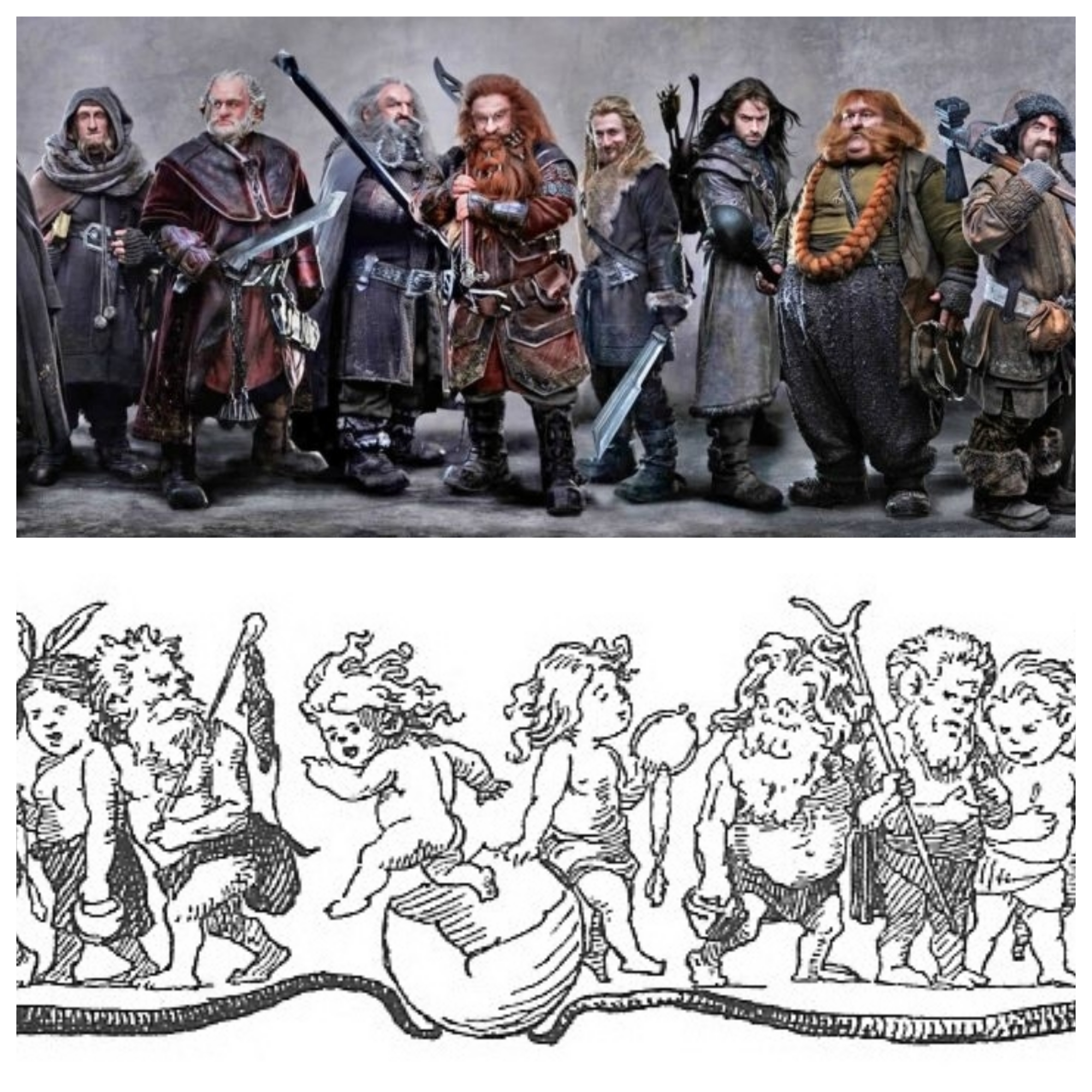Однак історію творять особистості, і творчість Толкіна не є виключенням. У середзем’ї безліч народів: ельфи, гноми, хоббіти і т.д. Для цього професор скористався скандинавськими міфами. Знайшовши в інтернеті книгу “Старша Едда” в розділі про пророцтво Вельви ми знайдемо такі звичні для толкіністів імена: Дурін, Двалін, Даїн, Біфур, Бофур, Бомбур, Філі, Кілі і навіть Гендальф. Стосовно гномів, то літературні і міфічні є майстрами ковальства, проте міфічні не були воїнами і їх неважко було обдурити[2].