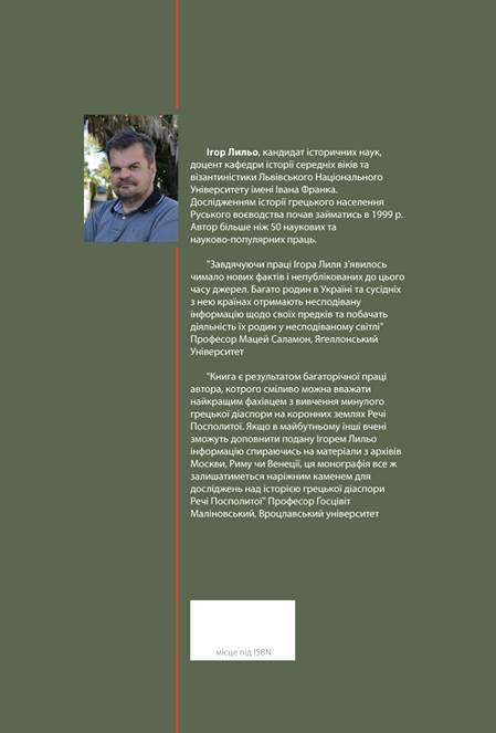 Монографію присвячено дослідженню історії грецького населення на території Руського Воєводства у XV-XVIII ст. Приділяється увага процесам, що передували появі грецьких іммігрантів в цій частині Східної Європи, особливостям їх економічної та суспільної діяльності. Особлива увага відведена місцю та ролі греків у щоденному житті громад Львова, Бродів та Замостя.