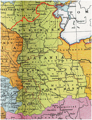 - Північну марку (Nordmark) – охоплювала землі підкорених велетських племен. Дісталась графу Дітріху фон Гальденслебену;