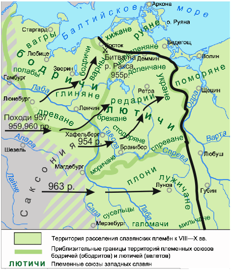 Окрім того, Оттон І, затвердивши свою владу в Італії, став імператором і створив Священну Римську імперію в 962 р. Це дозволило йому поступово встановити свій вплив на два важливі релігійні центри своєї новоствореної імперії – Святий Престол в Римі та Майнцьке архієпископство, що дало йому змогу реалізувати свої давні плани по створенню на слов’янському прикордонні архієпископство з центром в Магдебурзі, яке мало стати центром не лише організації навернення в християнство язичників на сході, а й підпорядкування інтересам Імперії новоутворених єпископств у Чехії та Польщі. Відбулось це створення в 968 р. разом виникненням нових єпископств на землях полабських слов’ян: до існуючих Гафельберзького і Бранденбурзького додалися ще єпископства в створених марках Мерзебург, Цайц, Майссен (усі підпорядковані магдебурзькому архієпископу) і в одному з найбільших ободритських міст Старигарді (сучасний – Oldenburg-im-Holstein; підпорядковане гамбурзькому архієпископу). Розширення церковної мережі на підконтрольних слов’янських землях мало формально за мету створення центрів, звідки була б організована місіонерська діяльність та проповідування християнства серед язичників. Проте якими би благими не були старання імператора Оттона, нова релігійна організація за своєю суттю виступала додатковим інструментом королівської влади. Адже ще початку його правління церква в німецьких землях щедрими земельними даруваннями була поставлена під контроль монарха і вона мала посилювати контроль над підкореними племенами[20]. Це в свою чергу створювало як підґрунтя до невдоволення через додаткові церковні побори, так і вибухонебезпечну для Імперії консолідацію слов’ян під приводом захисту своєї язичницької релігії.