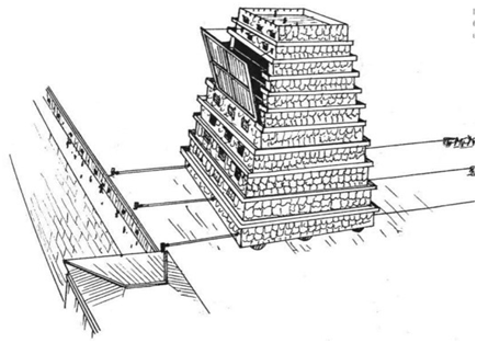 Пересування облогової башти до стін укріплення за допомогою тяглової сили худоби і канатів (джерело: Константин Носов, Осадная техника.