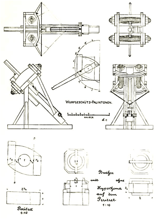 Конструкція політона (каменемета) за даними Філона: вид зверху, збоку і ззаду (ілюстрація з німецького видання “Белопойїки” 1919 р., автори — Г. Дільс і Е. Шрамм, http://www.simposium.ru/ru/node/12508).