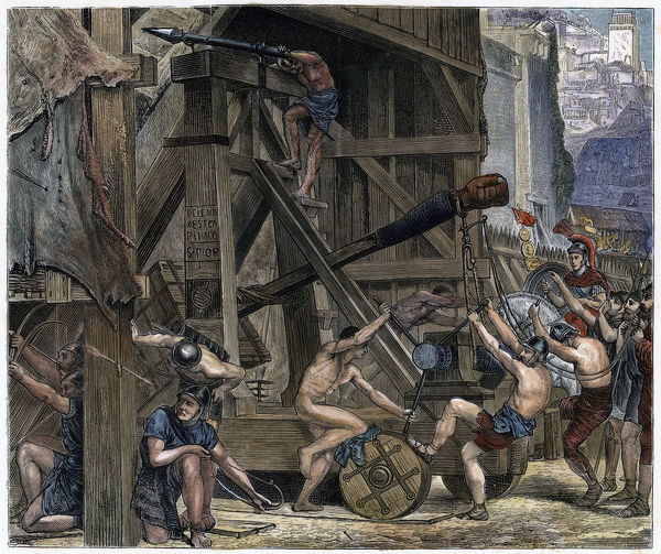 Першими відомими нам каменеметами прийнято вважати сааме літоболи, або балісти. Онагр (досілвно — “дикий осел”, через складнощі в роботі), або як його ще називають — монанкон, скорпіон, був найвідомішою торсіонною машиною і активно застосовувався протягом пізньоримської доби і всього Середньовіччя. Першочерговим завданням онагра було ураження живої сили противника на відкритій місцевості, та затримка просування військ на дальність пострілу. З огляду на ареал поширення і специфіку установки на кораблях, ми знаходимо опис онагра під час штурму Константинополя в 1204 р. Жорстка нерухома будова рами в ситуації, коли машина розташовувалась на площадці венеційського корабля, сприяла збільшенню стійкості конструкції і ефективності стрільби.