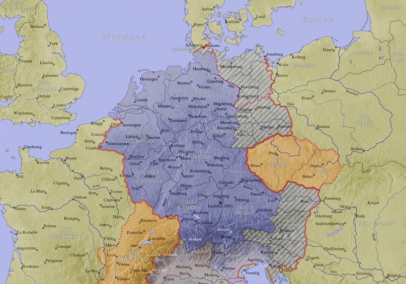 На той час, ядро середньовічної Німеччини складалося з п’яти племінних герцогств: Саксонії та Тюрінгії на півночі, Баварії й Швабії на півночі, а центральною землею була Франконія, географічне становище і родинні зв’язки племінних герцогів якої із Каролінгами, вплинули на вибір нового короля в листопаді того ж року. Ним став правитель Франконії Конрад. На його семирічне правління (911-918) випало чимало зовнішніх напастей і внутрішніх чвар: воєн з мадярами, що прийшли зайняли Паннонію ще в 896 р., боротьби за Лотарингію з Карлом ІІІ Простуватим та насадження авторитету корони в племінних герцогствах. Як і Каролінги, Конрад налаштував проти себе місцеву еліту, яка забезпечила йому трон. Налагодити стосунки не вдалося і з герцогом Саксонії та маркграфом Тюрингії – Генріхом I, сином Оттона Ясновельможного з роду Людольфінгів.