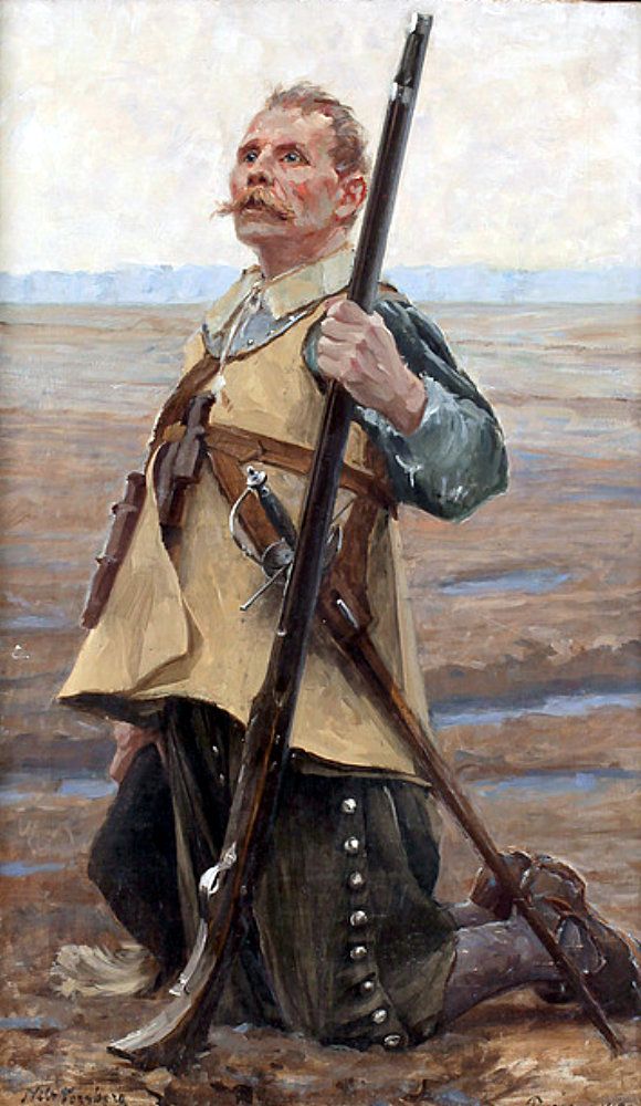 Шведський мушкетер на молитві. Солдат на картині з армії Густава ІІ Адольфа, перша третина XVII ст. Взагалі, у шведів ідеологічній підготовці приділяли дуже багато уваги – бійці мали з собою молитовники, і взагалі солдат завжди мав пам’ятати, що він тут не просто рекрут, якого з-під Стокгольму відірвали і послали бити ворогів короля в якійсь Баварії, а воїн віри, який бореться з єретиками за те, що у них неправильні відносини з Небом.