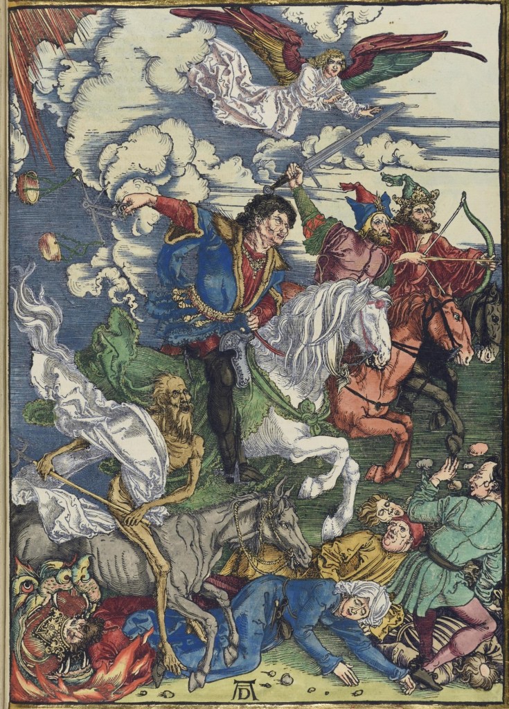 Отже, гордий власник прекрасного дорогого видання, повільно перегортаючи сторінки, милується чудовими гравюрами Дюрера, і тут… Більшості наших сучасників це взагалі не кинеться в очі. Але люди, незліченну кількість разів у своєму житті прослухали Одкровення Іоанна – в церкві, вдома, на уроках закону Божого – і давно вивчили його напам’ять, негайно помітять невідповідність. Як відомо, всього вершників Апокаліпсису чотири: Чума на білому коні і з луком, Війна на червоному коні і з мечем, Голод на вороному коні із вагами й Смерть на блідому (сірому) коні з косою (або зі списом).