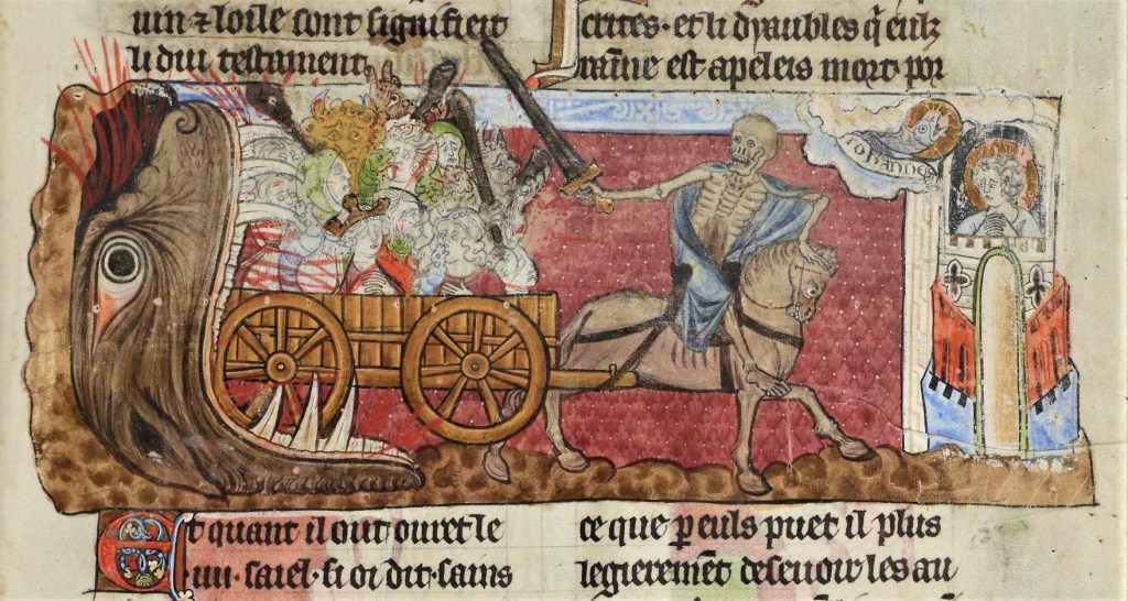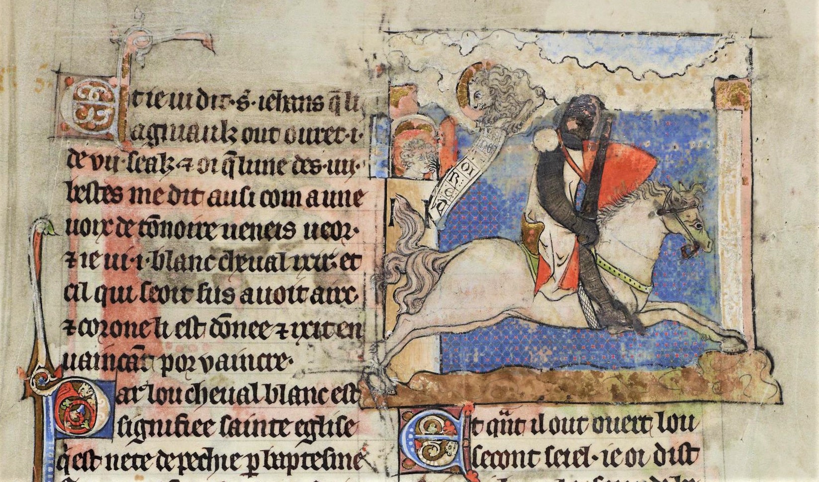 Так в першій половині століття уявляли вершників Апокаліпсису. Час сильно зіпсував ілюстрації, та й взагалі вони недомальовані, але все одно живописні.