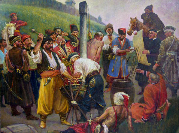 – Третя страта – киї запорозькі. Злочинця прив’язують до стовпа в Січі або в паланці на майдані чи серед базару, тоді заставляли їсти й пити, скільки захоче, а коли наїсться і нап’ється, тоді козаки починають бити його киями.