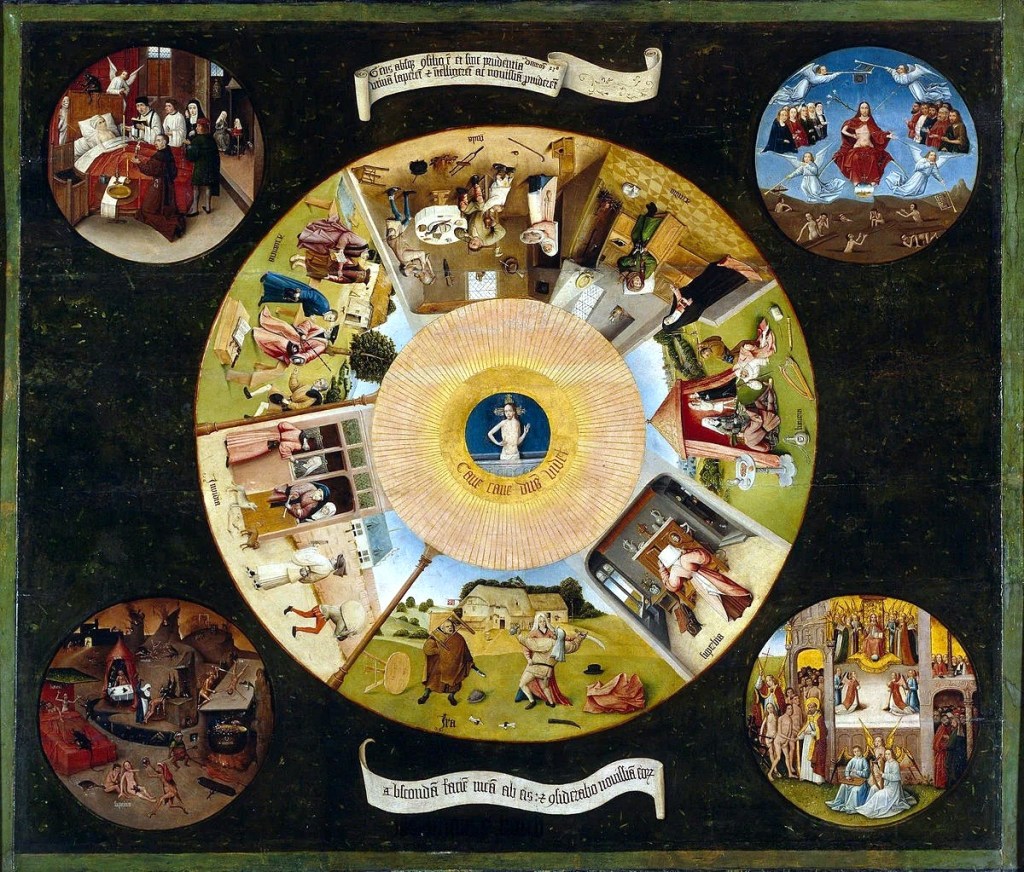 Картина написана в XV ст. Ієронімом Босхом, нідерландським художником, представником Північного Відродження. Зображення Семи смертних гріхів розташовані по колу, що означає сталість їхньої присутності. Босх включив їх в райдужну оболонку ока Бога, таким чином роблячи застереження тим, хто рахує, що уникне подальшої кари по смерті. Чотири круглих зображення по кутах (тондо), це «чотири останні речі», які доповнюють картину: вони зображують смерть, Страшний суд, Рай і Пекло. Слова, написані на свитках, що розвіваються, вказують: «Бо вони люд безрадний, і немає в них сенсу» і «Укрию обличчя Моє від них, і побачу, який кінець їхній».