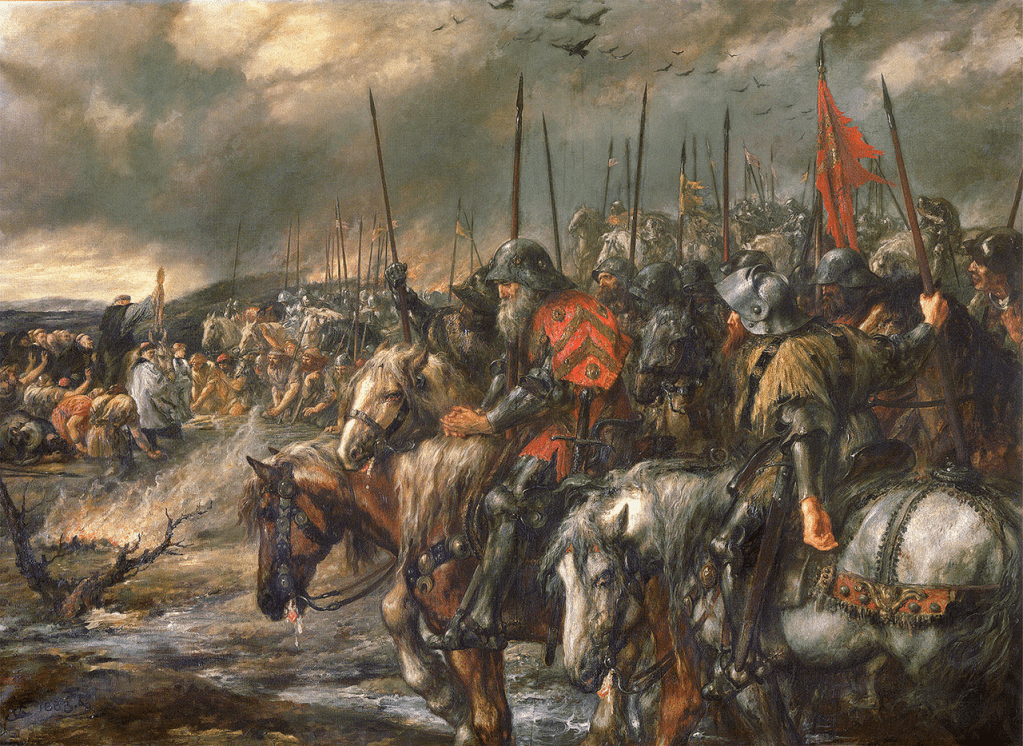 На картині художника Джона Гілберта (1884) зображений дощовий ранок перед битвою при Азенкурі 25-го жовтня 1415 р.