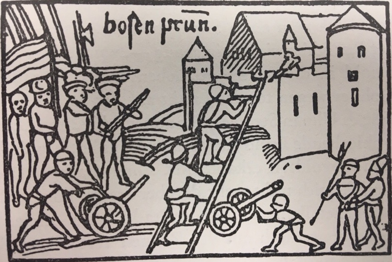 На той момент він все ще володів обома руками – у 1505 р. його права кисть буде відірвана ядром нюрнберзької, що характерно, гармати, і замість неї він до кінця днів буде носити залізний кулак, який принесе йому більшу славу, ніж будь-яке його діяння.