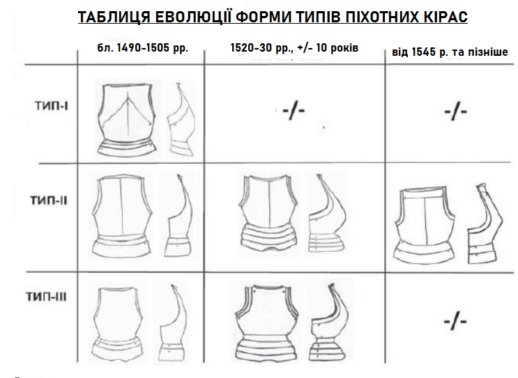 Найбільш доступним та масовим захистом для регіону на час правління імператора Максиміліана І (1508-1519 рр.), були кіраси без наспинника (тобто нагрудники). Цінною при опрацюванні теми, а також матеріальних пам’яток, став доробок зброєзнавця І.М. Петрухіна, який ставив перед собою завдання систематизувати за типологією піхотні обладунки Священної Римської Імперії першої третини XVI ст. Музеї Німеччини, Австрії та Польщі мають достатню кількість збережених до наших днів артефактів, а деякі з них навіть мають позначки арсеналу Нюрнберга, що для нас особливо цінно.