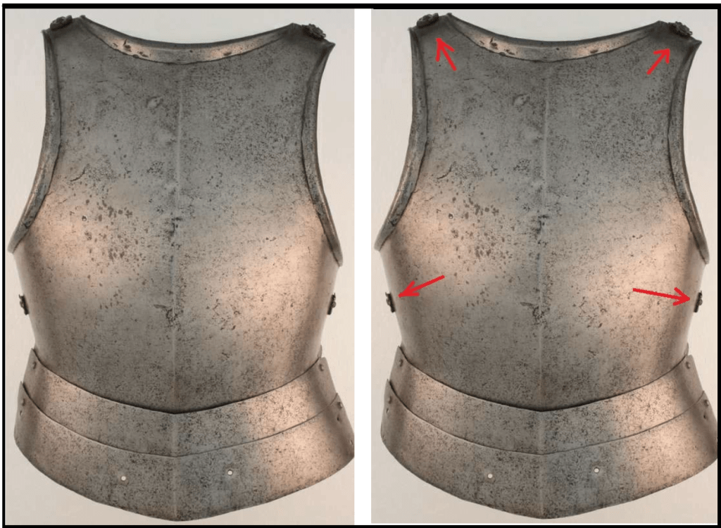 Вивчаючи варіанти можливого кріплення ременів, ми зіткнулися з тим, що ми не маємо достатньо повного розуміння того, яким чином носили на практиці нагрудники даних типів. Нами були вивчені артефакти кінця XV – початку XVI ст., переважно німецького та італійського виробництва. На підставі емпірично отриманих даних, можемо виділити три можливих варіанти кріплення ременів на нагрудниках.