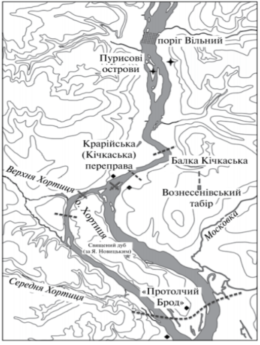 Відтак, найімовірнішою видається гіпотеза, що руські й скандинавські купці та воїни поблизу о. Хортиця (чи на самому острові) приносили мечі в жертву богам. Це перегукується зі свідченням К. Багрянородного про те, що на о. Св. Георгія (Хортиця) руси приносять жертви священному дубу [11, c. 48–49]. О. Комар на підтвердження «жертовної гіпотези» відзначає, що серед дніпровських мечів немає жодного, який би не був дуже багато оздобленим, таким, який би не був гідним піднесенню богам [10, c. 58–59].