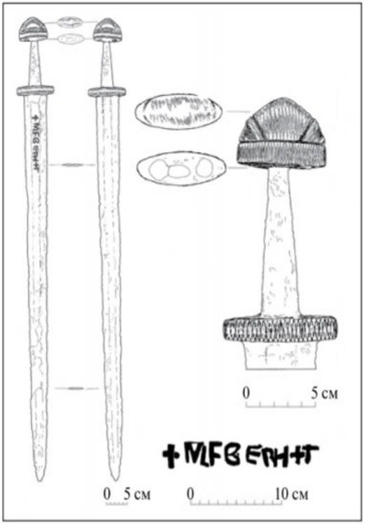 У цьому контексті необхідно згадати п’ять мечів Х ст., виявлених у 1928 р. в процесі будівництва дамби Дніпровської ГЕС [10, c. 47]. Кожен із цих мечів також був багато оздобленим у скандинавському стилі, деякі мали характерне франкське клеймо у вигляді слова «ULFBERHT».