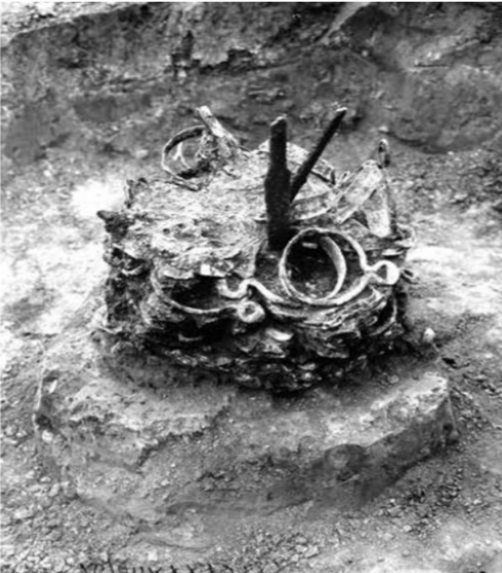 Однак серйозна дискусія розпочалася після відкриття на території Вознесенської гірки (зараз м. Запоріжжя) «Вознесенського скарбу» у ході Дніпробудівської археологічної експедиції 1927–1932 рр., яка діяла у зв’язку зі спорудженням «Дніпрогесу» [20, с. 106]. Варто зазначити, що скарб було виявлено неподалік курганного могильника (до 80 курганів) і прямокутного укріплення з невисоких валів завдовжки 52 м і завширшки 51 м із похованням-спаленням у центрі [20, c. 106]. Скарб становив собою циліндричну яму глибиною до 90 см і діаметром до 70 см, у якій знаходилися нашарування залізних, срібних і золотих предметів. Серед них стремена, вудила, стріли, окуття піхов шабель та срібні фігурки лева та орла зі змією в лапах; зверху скарб було простромлено трьома шаблями [20, c. 106–108].