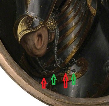 По датуванні – ризикнемо припустити, що використання пеляма з двома точками кріплення для нижньої пари поводів (за допомогою якої власне і задіюється важель) – і обидві точки кріплення саме на нижньому важелі, – за часом поширення обмежений, схожий приклад можна знайти у Кранаха за 1549 р. Тому вудила, схоже, підтверджують наведене вище датування шолома. Відмінність в тому, що чоловік на портреті вирішив обмежитись нижньою парою поводів, пристебнутими до верхніх кілець нижніх важелів (червоні стрілки), і не пристібати ще одну пару до нижніх кілець (зелені стрілки).