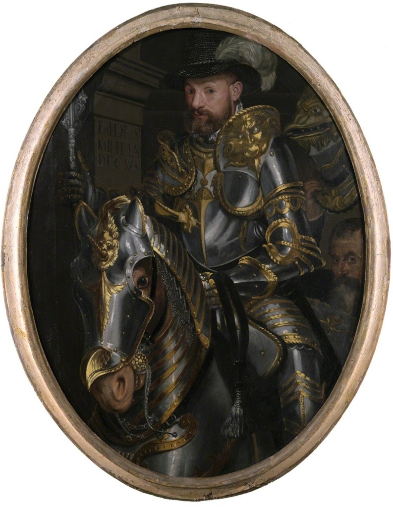 І ось, схоже, знайшовся господар цього шолома, а з ним і інші частини обладунку. На інтернет-аукціоні виставили кінний портрет невідомого нобіля у фантастично оформленому спорядженні. За його спиною слуга тримає такий же шолом (відмінності відшукати можна, бо живописець – не фотограф). Картину віднесли до творчості Оттіно Паскуале й датували початком XVII ст. Тепер слід би визначити, що це за пан.