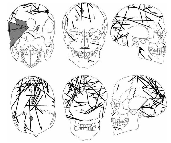 - Низька якість шоломів [3]. Перевага цієї теорії в тому, що вона пояснює одинакові поранення у зовсім різних битвах, незалежно від географії та хронології. Тільки є нюанс – вже з XIV-XV ст. обладунки були з малим відскотком включень шлаку – аби їх пробити, треба мати немалу силу;