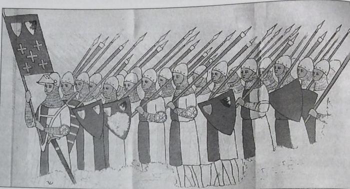Цей прийом полягає в тому, що спис тримається під пахвою (древко підхоплюється знизу), вершник впирається між стременами і задньою лукою сідла, а кінь пускається в галоп. Ще в X ст. вершник колов списом, тримаючи його на витягнутій руці або атакував, тримаючи його наперевіс, використовуючи швидкість атаки, але принципова різниця таранного удару полягала в тому, що лицар, впершись у стремена й сідло, становив єдине ціле з конем і удар не гасився силою рук. З іншого боку, піхотинці в лицарських арміях зайняли переважно в підлегле становище – вони займалися обслугою, розбивали табір, а в бою перебували у другій лінії. Тобто якщо в Античності кіннота розташовувалася на флангах армії, а центр формувала піхота, то зараз пішим воїнам відводилася роль резервної лінії за кавалерією. З цих подій народилася абсолютно концепція того, що кіннота стала настільки сильною, що жодна піхота не могла їй протистояти в чистому полі від слова “взагалі”. Ну а гучні поразки лицарської кінноти в XIV ст. при Куртре (1302 р.), Кресі (1346 р.), Моргартені (1315 р.) або Беннокберні (1314 р.) легко пояснювались особливостями місцевості [1]. Аби розібратись, що сталося з піхотою й кіннотою в XI ст., необхідно зрозуміти, що з себе представляло середньовічне суспільство, які принципи комплектування армій існували та за рахунок чого вони існували. На той час, як лицарство уклалось в власний військовий клас, суспільство остаточно розшарувалося на воїнів (якраз лицарів), духовенство та селян. Тобто той клас, який раніше був основним джерелом великих мас піхоти, був практично виключений з військового життя (ну або перепханий на другий план). Другим аспектом стала вельми специфічна феодальна економіка, яка переважно опиралася на натуральне господарство. Феодальне суспільство в принципі мало підходило для централізованого збору ополчення – васал був зобов’язаний служити сюзерену військовою службою [2], але аж ніяк не регулярними податковими виплатами.