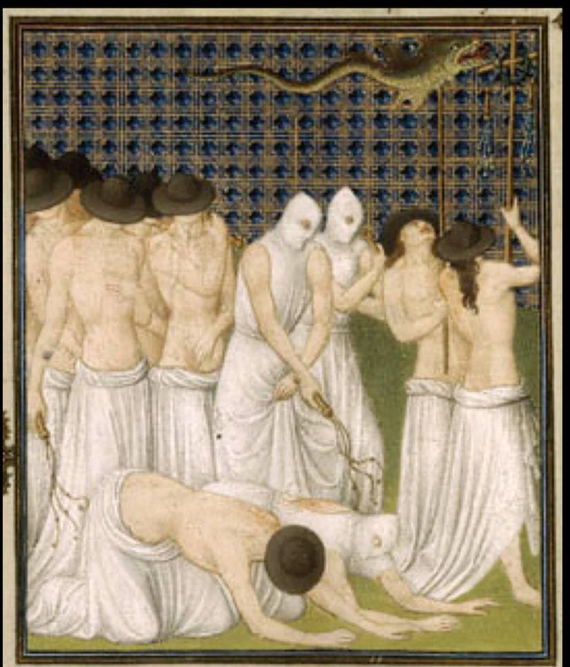 Віра людей у Боже покарання у вигляді Чорної Смерті мало ще один досить дивний психологічний прояв у русі флагелантів. Флагеланти – група ченців і фанатичних мирян, котрі віри, що чума то є пряме покарання за людські гріхи. Вони проявляли смирення, що сильно приваблювало людей, а також не давало змоги єпископам їх повністю придушити. Назва флагелантів походить від латинського слова батог. Сам рух, імовірно, виник в Австрії у 1348 році, згодом поширившись на Угорщину, Польщу, Німеччину, Францію, Фландрію, Голландію. До 1349 року послідовників вже нараховувалося близько півмільйона на теренах Західної та Східної Європи. Вони прагнули показати Господу своє каяття, свою покору, аби над ними змилилися. Вони привселюдно хлистали себе та одне одного батогами та вузликовими шнурами тричі на день. На рани від побоїв вони клали каміння або кропиву, імітуючи при цьому подвиг Христа. Учасники руху Флагеланів мандрували від міста до міста, співали гімни, молилися 33 рази на день – стільки років Ісус був на Землі. Коли флагеланти заходили в місто, їхні лідери починали проповідь перед великими натовпами. Це непокоїло єпископів та Папу Римського Климента VI, оскільки проповіді проводилися часто не служителями церкви й по усталеним канонам, а аматори. До того ж з часом флагеланти почали критикувати офіційну церкву та духовенство. У жовтні 1349 року Папа Климент офіційно засуджує флагелантів за поширення єресі. Тепер єпископам і церковним служителям можна і необхідно було зупиняти процесії будь яким чином. Флагеланти арештовувалися і розганялися під загрозою страт. До 1350 року течія флагелантів повністю зникла.