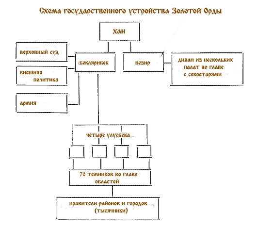 Проте до часу придбання повного політичного суверенітету в Золотій Орді, природно, вже існувала власна внутрішньодержавна структура, причому яка вже в достатній мірі склалася і була розвинена. Немає нічого дивного в тому, що вона в основних рисах копіювала систему, запроваджену в Монголії ще Чингісханом. Основою цієї системи було армійське десяткове літочислення країни. Відповідно до армійського членування вся держава ділилася на праве і ліве крила. В улусі Джучі праве крило склало володіння хана Бату, що тягнулися від Дунаю до Іртиша. Ліве крило знаходилося під владою його старшого брата хана Орди. Воно займало землі на півдні сучасного Казахстану вздовж Сирдар’ї та на схід від неї. За давньою монгольською традицією праве крило називалося Ак-Ордою (Біла Орда), а ліве – Кок-Ордою (Синя Орда). Улус Джучі після 1242 р. розділився на два крила, що склали самостійні володіння двох ханів – Бату і Орди. Однак хани Кок-Орди протягом всієї її історії зберігали по відношенню до ханам Ак-Орди певну, значною мірою чисто формальну, політичну залежність.
