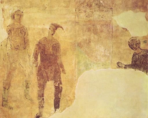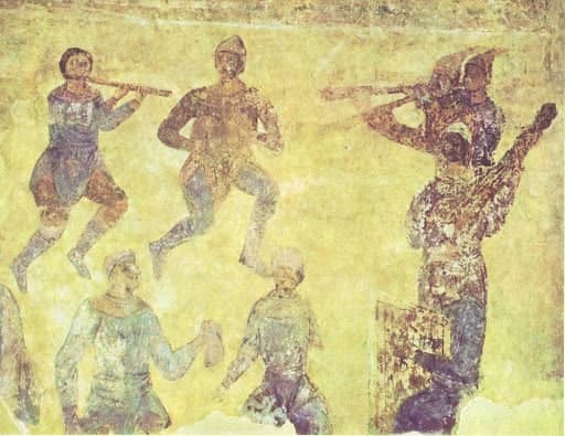 Так, стіни Софійського собору у Києві зберегли зображення музикування скоморохів. На одній з фресок зображено скомороха, який грає на струнному смичковому інструменті типу Фіделя.
