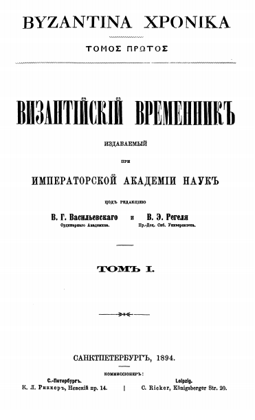 [4] Дубровин Н. Ф. Византийский Временник за пять лет (1894—1898). Из отчёта г. Непременного секретаря Имп. Акад. наук, читанного на акте 29 декабря 1898 г. Приложение к VI т. “Византийского Временника”(Санкт-Петербург, 1898): 1–23.