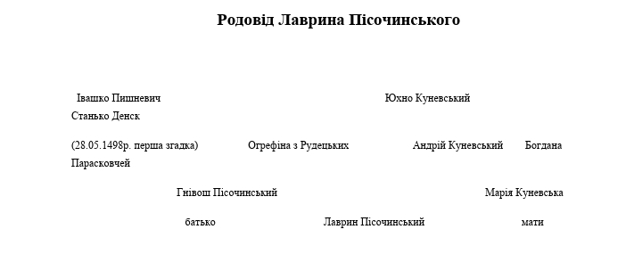 В цій частині пройде короткий виклад інформації, безпосередньо пов’язаний із постаттю Лаврина Пісочинського та його справою по маєтку Куневі. Я вважаю правильним навести родове дерево Лаврина Пісочинського, на основі статті.