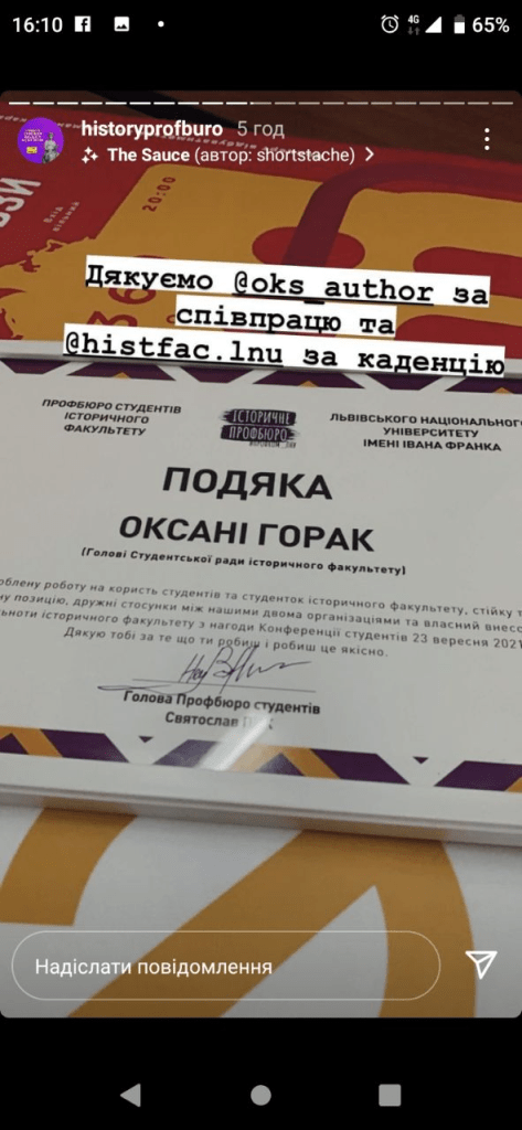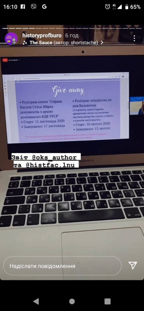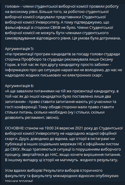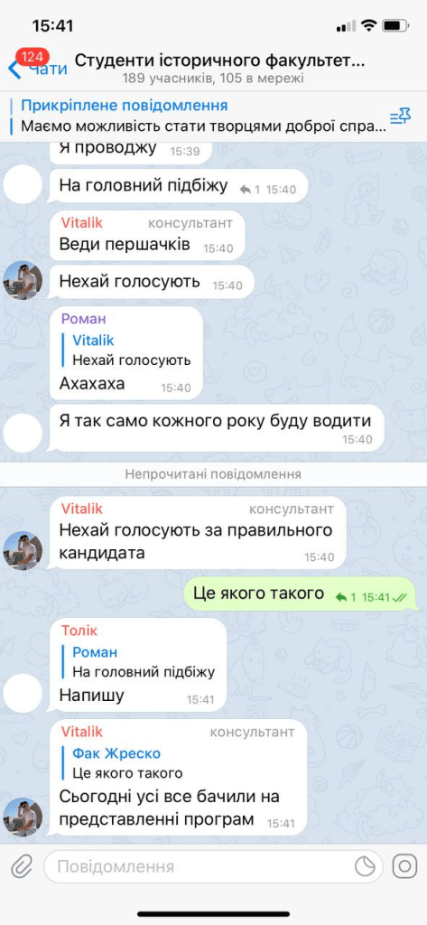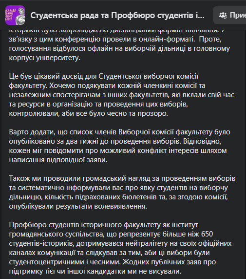 Здавалось би, все логічно – звіт Оксани Горак, як ранішої голови Студради, робота дільниці. Тільки незрозуміло, де згадка програм обох кандидатів у дописах. Вікторію Норичку так взагалі не згадали на ресурсах організації, виходить? Судячи ж бо із самого контексту скріншотів, висловитись у повній мірі дали тільки Оксані. Тему “непідтримки зсередини” ілюструє заява одного із учасників полілогу для студентів історичного факультету, який займає посаду деякого “консультанта”: