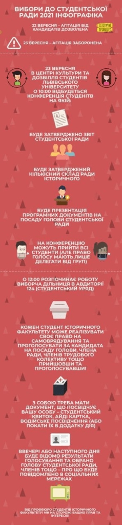 Поштовхом до цього було озвучення підтримки з боку команди ЛМК одному із претендентів на посаду голови Студентської ради нашого історичного факультету, 22 вересня цього року. Самі ж вибори проходили наступного дня, 23 вересня, у стінах Університету. Загалом, на посаду голови Студради було висунуто дві кандидатури – Оксани Горак та Вікторії Норички, студенток ІІІ курсу. За результатами, виграла перша. Сам процес зміни влади відбувався у кілька етапів – проведення конференції студентів факультету, від 10:00, де зпосеред усього, кандидати презентували свої програми, і власне голосування – від 11-ї до 17-ї години.