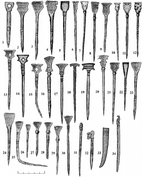 Записи на бересті, а також горщиках, шиферних пряслицях, корчагах та інших предметах робили спеціальним інструментом – писалом. Вони виготовлялися із заліза або бронзи у вигляді круглого у плані стрижня і лопатки з прямим лезом у верхній частині. Інколи на місці переходу вістря в лопатку стилі прикрашалися валиками. Кожне писало було унікальним за формою навершя, що свідчить про унікальність та значення таких інструментів. Тривалий час у науковій літературі їх інтерпретували по-різному. Вони згадуються як “шпильки”, “інструменти для лініювання пергаменту”, “ложечки для причастя”. Між тим, уже в античний період у Греції та Римі подібні знаряддя були добре відомі і їх називали “стилями” (stilus).