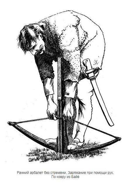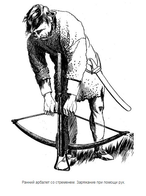 Перший і найпростіший пристрій для полегшення натягування називається стременом. Це була залізна скоба прикріплена на передній частині станка. Стрілець ставив самостріл скобою на землю і, просунувши в неї ступню, обома руками натягував тятиву [8, с. 92-93].