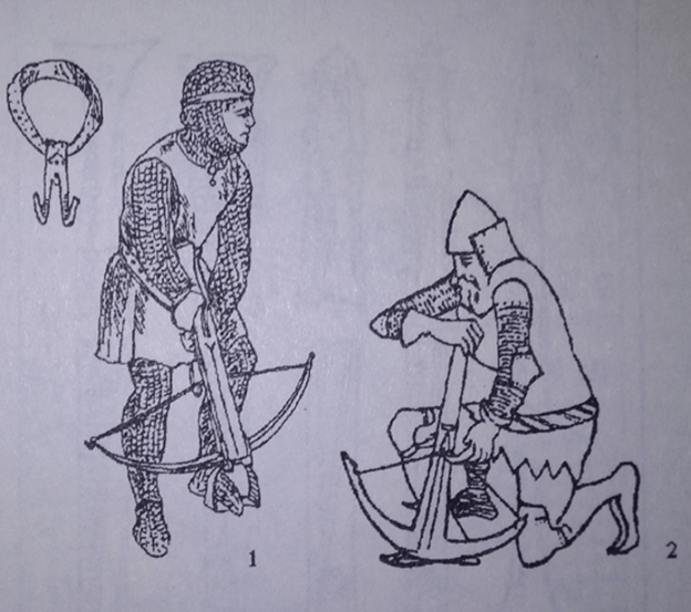Як вже було зазначено раніше, суперечки щодо появи арбалета на Русі та його поширення тривають і досі. Перша згадка самостріла з’являється у Никонівському літописі під 1159 р. при описі загибелі чернігівського князя Ізяслава Давидовича на р. Желані – “Ивлор же Геденевич… удараша его ис самострела в мышку”. Самостріл зображено і на мініатюрах Кенігсберзького літопису, які ілюстрували події 1151 і 1184 р. [2, с. 165]. Проте, на мою думку, невірним є твердження О. Мєдвєдєва, який наводить першу літописну згадку арбалета в 1184 р. “У половців були якісь вогняні сняряди “иже стреляша живым огнем” і ”луци тузи самострельнии, одна 50 мужь можашеть напрящи” [8, с. 92]. Під живим вогнем літописець мав на увазі грецький вогонь, це видно із наступних слів, які автор наводить після перемоги над половецьким ханом Кончаком – ”оного басурманина яша, у него бяшет живой огонь, то и того ко Святославу приведоша со устроенным (огнем)”. Подальша частина розповідає про метальну артилерію, на що О. Медведєв також вказує, незрозумілим залишається, чому він відносить цю згадку до арбалета. Можливо помилка полягає у назві самостріл, адже арбалети та балісти на Русі називали самострілами. Проте у них є суттєві відмінності, облоговий самостріл в рази більший, зазвичай стаціонарний, та не є ручною зброєю, а його метою є знищення ворожих укріплень. Також він класифікується як артилерія, а його згадки врази давніші ніж ручного самостріла. Отже, порівняння облогового самостріла з арбалетом є помилкою, яку можна зіставити із порівнянням мушкета з гарматою. Літописні згадки арбалета на Русі у XII ст. досить рідкісні, але це й не дивно. У Західній Європі відомі поодинокі згадки арбалета ще у X ст., проте розповсюджуватися починає із хрестовими походами XII – початку XIII ст. Відомо, що Річард Левове Серце близько 1190 р. озброїв арбалетами свої загони, а Філіпп Авґуст (1180–1233) створив у Франції перші загони арбалетників, які були пішими та кінними [10, с. 206].
