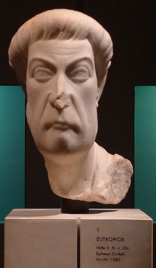 Довелось пускати у хід важку артилерію. Колись Євтропій влаштував шлюб імператора з Елією Євдоксією, донькою полководця Бавтона, франка за походженням, що був консулом 395 р. Імператриця швидко освоїлася при константинопольському дворі, і як водиться жінці, почала робити свої порядки – лізти на голову чоловіку. Євдоксія влаштувала спектакль, гідний найкращих античних театрів. Ридаючи, вона заявила августу, що Євтропій знахабнів настільки, що погрожував вигнати її з дітьми з покоїв імператора.