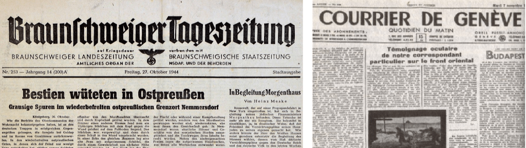 “Помста за Неммерсдорф” — таким був його бойовий клич, за його допомогою він хотів активізувати опір населення [Прим. пер.: завдяки чуткам про прийняття “Плану Моргентау”, німцям бажання воювати тоді не бракувало й так]. 26 жовтня 1944 р. міністр пропаганди записав у своєму щоденнику: “Ввечері дзвонив Герінг та повідомив в подробицях про звірства, скоєні у відвойованих нами селах та містах Східної Пруссії. Я використовую їх для агітації в пресі, щоб найпростіші спостерігачі переконались, що чекає німецький народ, якщо більшовизм переможе”.