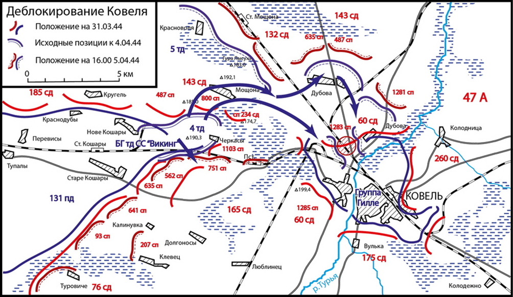 Навесні 1944 р. в ході Поліської наступальної операції[1] радянська 47-а армія взяла в кільце «фестунг Ковель» – важливий залізничний вузол на Волині. Німці, бажаючи відбити стратегічний пункт, імпровізували, як і до цього – в Дем’янську[2], при спробах деблокувати Сталінград[3], та пізніше, в ході боїв за Тернопіль[4]. Вони сформували ударне угрупування із 131-ї піхотної дивізії Вермахту та бойової групи 5-ї танкової дивізії СС «Вікінг» під загальним командуванням XLII армійського корпycy[5]. Структурно, корпус підпорядковувався спочатку 4-й танковій армії при Групі армій (ГА) «Південь».