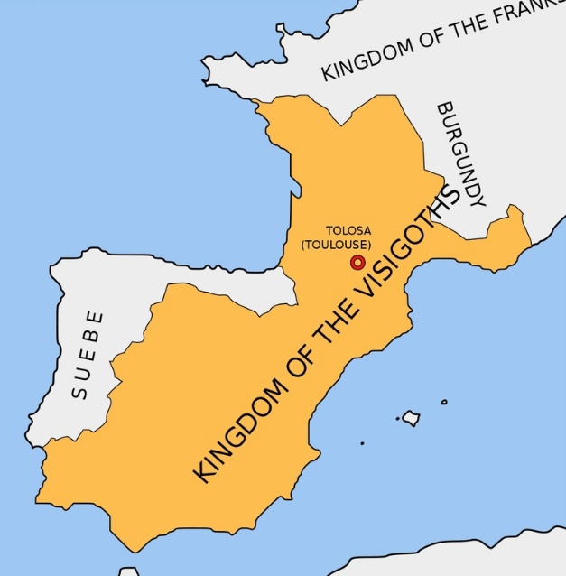 Почати слід із вестготів. Адже саме ця сила претендувала на панування над усім півостровом і через багато років практично домоглась бажаного. Однак, шлях західної гілки готів на Піренеї був тяжким. До кінця V ст. Вестготське (або радше Тулузьке, за назвою столиці) королівство контролювало левові частки старих римських провінцій Галлія Нарбоненсіс та Галлія Аквітанія на півдні та заході. І саме галльські володіння вестготські правителі були схильні розглядати як вотчину. Щодо Іспанії, то там становище було неоднозначним. Вестготи просунулись у північно-східну Іберію, де раніше була провінція Тарраконенсіс. Проте укріпитись в регіоні не змогли, що продемоснтрувало повстання Бурдунелла у 496 р. Від того, що ватажка повстанців відправили до духовки у вигляді мідного бика, біди місцевої адміністрації не зменшились. Чого вже говорити про інші регіони, де вестготську владу признавали або опосередковано, або взагалі посилали подалі. Вважають, що вестготи проникали вглиб Іберії, але переважно силами своїх військових контингентів, а не хвилями переселенців.