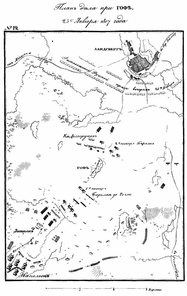 Цікавим епізодом його воєнної кар’єри був момент, коли вкінці січня 1807 р. він прикривав марш війська Беннігсена на Ландсберг, ведучи дрібні бої та влаштовуючи засідки французами, сповільнював їх дії, при тому, що на нього тиснули значна частина Великої армії: кавалерійські корпуси Мюрата, корпуси Сульта, Ожеро та імператорська гвардія. 6 лютого російська 70-тис. армія дійшла до тих місць та почала споруджати позиції в районі сіл Прейсіш та Ейлау. Барклаю був наданий наказ тримати переправу через струмок з крутими берегами при селі Гоф, щоб виграти час і краще підготуватися до генеральної битви. Коли до мосту через нього наблизився французький авангард у вигляді дивізії легкої кавалерії, при якій був маршал Мюрат, а згодом туди прибув сам Наполеон, французькі кінні єгері та гусари неодноразово кидалися на міст, але зупинялися від контратак російських гусар та залпів картечі від кінної артилерії. Така напружена ситуація тривала кілька годин, поки не підійшла піхота з корпусу Сульта та кірасирська дивізія, під тиском яких піхотні полки Барклая в одному каре відступали до основних сил, але при одній з атак кірасири протаранили і таки прорвали каре, перерубавши більшість піхотинців там. Лише прибуття 5 батальйонів підкріплення від Беннігсена дозволило Барклаю де Толлі відвести до своїх вцілілі залишки (3 і 20 єгерські полки) ар’єргарду. Не заважаючи на розгром, завдання по затримці було виконане[5].