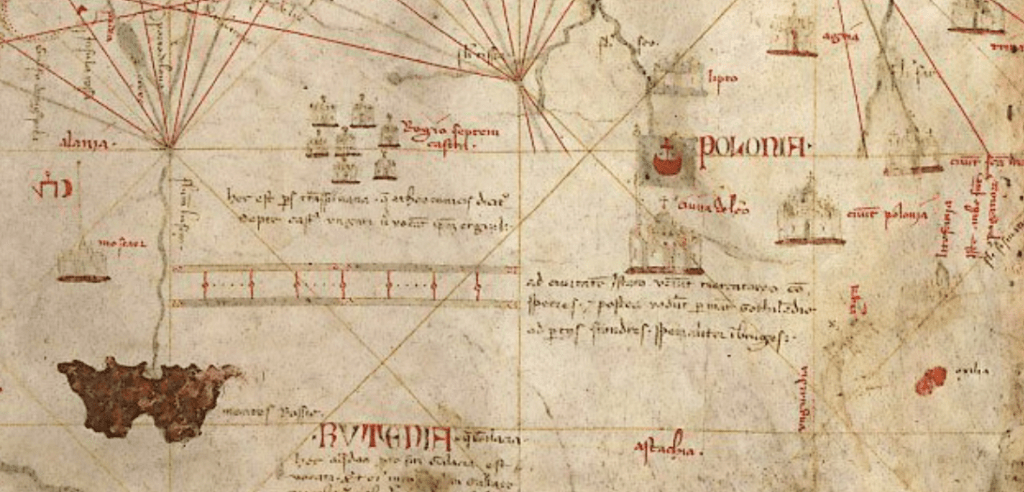 “До цього міста прибувають купці із прянощами, [які] пізніше вирушають через Готландське (Балтійське) море до області Фландрії, здебільшого в [місто] Брюгге”.