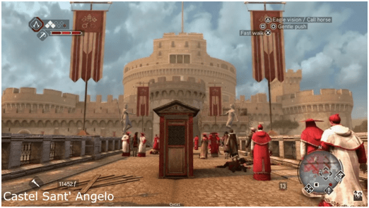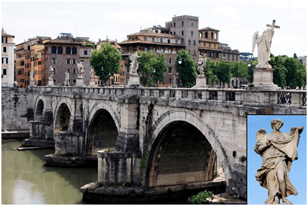 На мосту розташовані статуї 10-х ангелів, а також статуї апостола Петра та Павла. Цікаво, що в грі замість них розміщені статуї Нептуна, які є копіями статуї з фонтана Нептуна в Болоньї, в Італії.