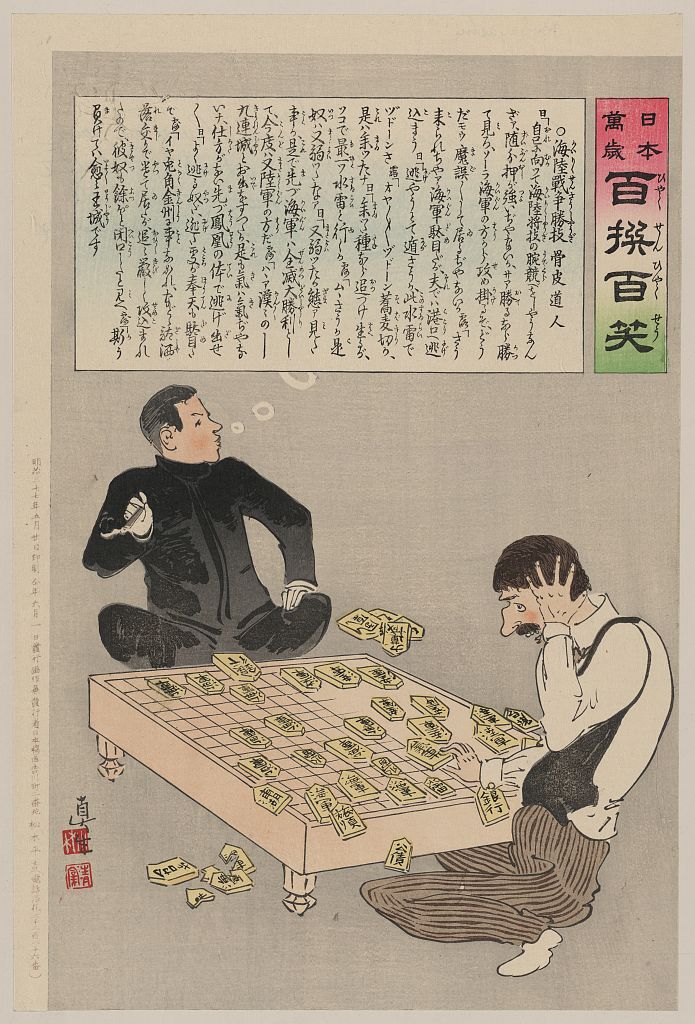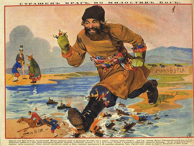 Щодо японської сторони, то вона активно висміює московитів як слабкодуху та технічно відсталу армію. Такими є гравюри Кобаясі Кійочіка (Kobayashi Kiyochika), який представляє японську візуальну пропаганду часів російсько-японської війни.